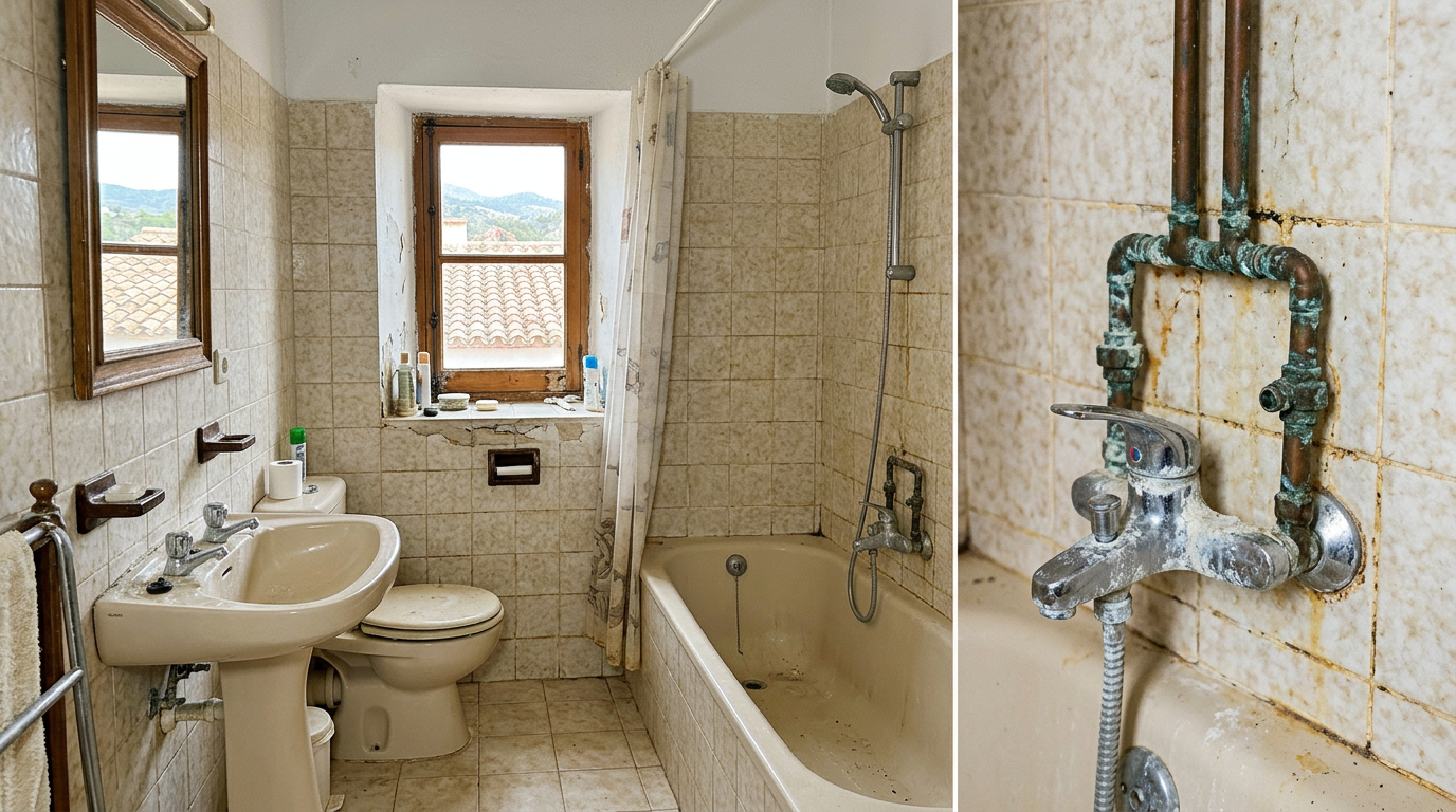 El baño de arriba necesita una nueva instalación de fontanería.El agua caliente apenas llega a los grifos.Casa construida en1985contuberías de cobre originales, sin tocar desde entonces. La caldera de gas es unaVaillant ecoTECen la cocina de abajo. El baño incluyelavabo, ducha y váter. Villa independiente.