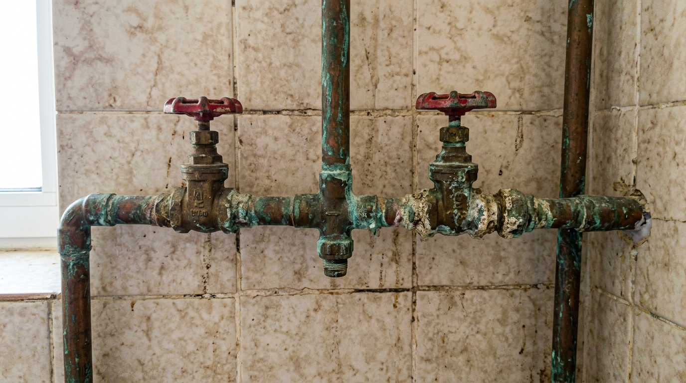 James encontró una tubería corroída detrás de la pared durante la instalación — hay que reemplazarla por seguridad antes de continuar.